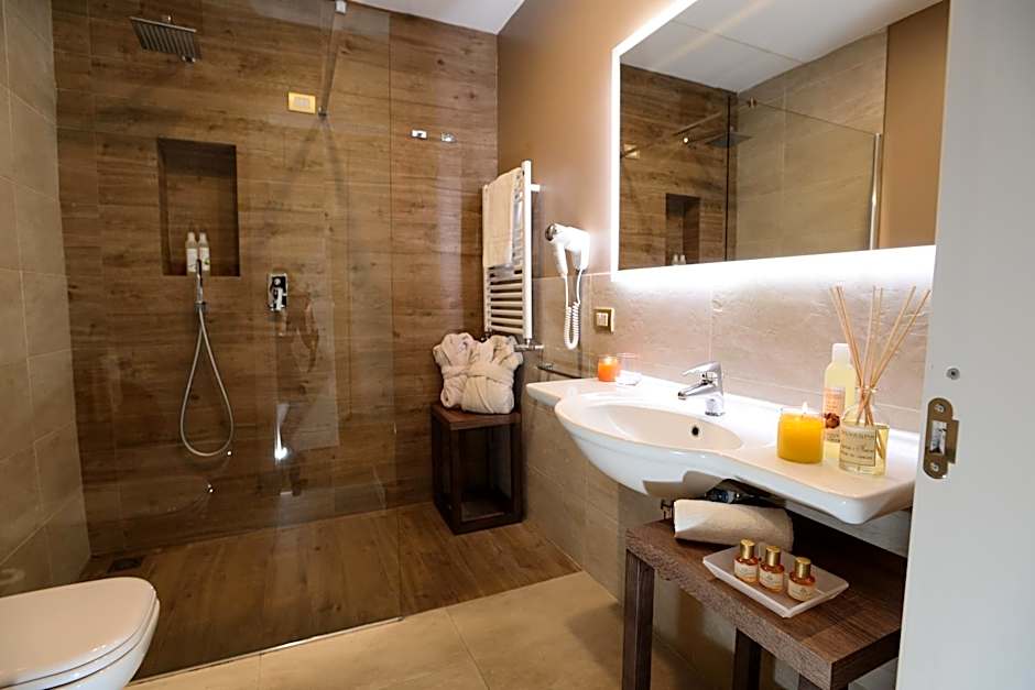 Room with attached bathroom with parquet floors, decorated with classic wooden furniture. Offers air conditioning, free WiFi, and a flat-screen TV with Mediaset Premium channels.